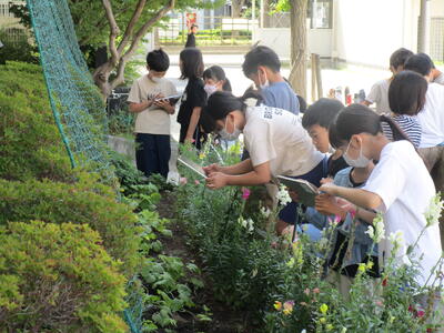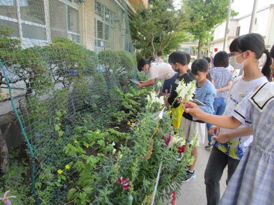 4年生、苗から地植えした「ツルレイシ」の様子を観察しました。葉の枚数も増え、ツルも伸び、黄色い花が咲いているものもありました。地植えした場所が狭いので、端末で写真に撮り、教室に戻って記録するようです。