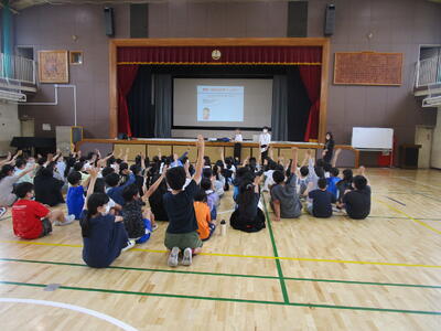 6年生、2校時に千葉県の税務署の職員の方がゲストティーチャーとして来校して、体育館で「税」の話をしました。「税金はどんな税金があるか知っていますか」の質問に「所得税」「自動車税」「法人税」などと積極的に答える子供たち。税金の種類や使い方を学び、「もし、税金がなかったらどうなるのか」を動画で確認しました。税に対する知識が広がりました。