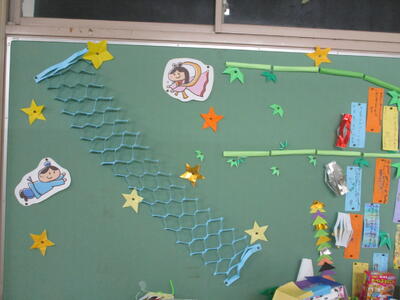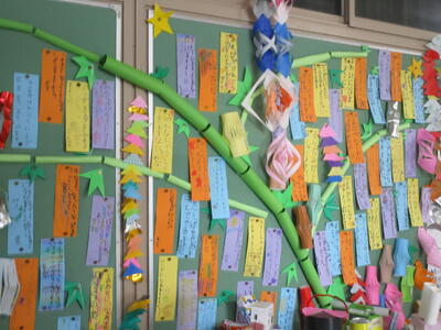 1年生、教室の向いの壁面に七夕飾りがあり、1年生の願いごとが掲示してありました。「跳び箱がとべますように」「折り紙がうまくおれますように」「パン屋さんになれますように」「ケーキ屋さんになれますように」「しあわせになれますように」・・・本当にいろいろなお願い事が短冊に書かれていました。