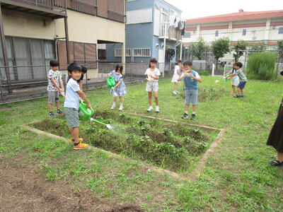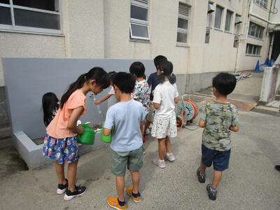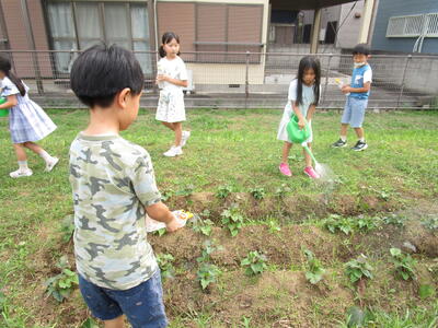 2年生、朝からサツマイモの苗が植えてあるグリーンジャイアントに水やりに行きました。各クラス約10名ずつが輪番で水やりに行っているそうです。今日の10人もはりきって水やりをしていました。苗は少しだけ大きくなっていました。秋には、おいしいサツマイモができるといいですね。