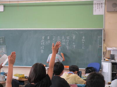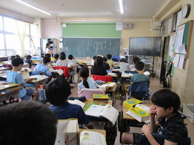 5年生の別のクラスでは国語で「複合語」の学習をしていました。複合語とは、二つ以上の言葉が組み合わさって一つの言葉となったものという担任の説明を受けた後に、皆で練習問題に取り組んでいました。「使う+分ける」はどんな言葉になるか、「見比べる」はどんな言葉に分けられるかなど、練習問題では多くの児童が積極的に挙手をしていました。