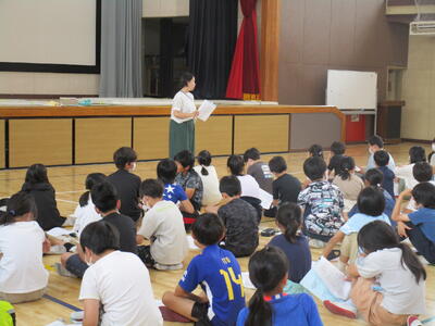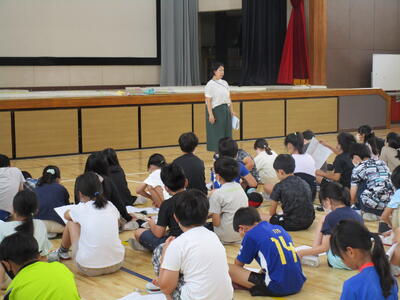 5年生は、来週に予定されているネイチャースクールのしおりができあがり、しおりをもって学年で体育館に集まり、目標や持ち物などを確認していました。