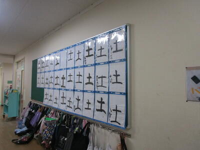 3年生の廊下前には、書写の作品が掲示されています。「土」・・・横画と縦画の組み合わせの文字です。自分の名前も書いてあります。どの作品からも一生懸命に頑張った思いが伝わってきます。