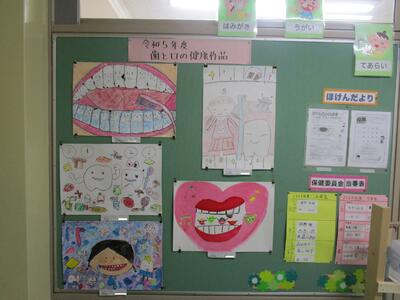保健室の前には、「令和5年度歯と口の健康作品」が掲示されています。どのポスターも子供らしい作品で素敵ですね。