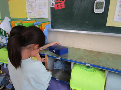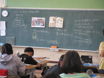 2年生、算数の長さの学習で、教室にあるいろいろなものの長さを予想して測っています。教科書の縦や横の長さや、後ろのロッカー一つ分の縦の長さ等を測り、カードに書いていました。