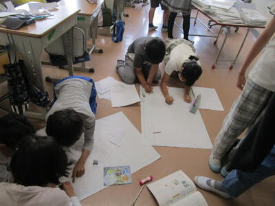 5年生、国語の「町じまんをすいせんしよう」の学習で、範囲を広げ県の中で推薦できる場所を決めて、グループごとに付箋を使ってまとめています。「中央こども図書館」「成田ゆめ牧場」「ディズニーランド」「zozoマリンスタジアム」等。皆、自分が行ったことある場所を選んでいるので、よいところが具体的にたくさん書けていました。