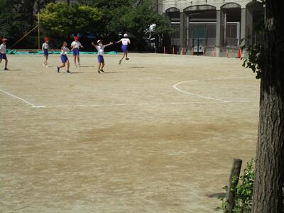 5年生、ベースボール型ゲームを4チーム、2か所に分かれて行っていました。バッターボックスに立った児童は、投げたボールを打つのではなく、思いきり、遠く へボールを投げています。守備や得点のルールも普通の野球とは違い、皆が走って活躍できるようになっていました。