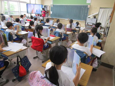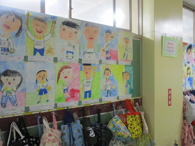 今日は、あいにくの雨模様です。1~3年生の学習参観と懇談会があります。校内は雨の日でも楽しくなるような色々な掲示物があります。七夕飾りで、願い事を短冊にかいて掲示しているクラスもあります。1年生は、運動会の絵を描いてありましたが、笑顔で踊ったり、頑張って走ったりする様子が大きく、描けていました。背景に塗った絵の具の色が鮮やかできれいでした。1年生、国語で、つながりを考えて、言葉をつなぐ学習をしていました。