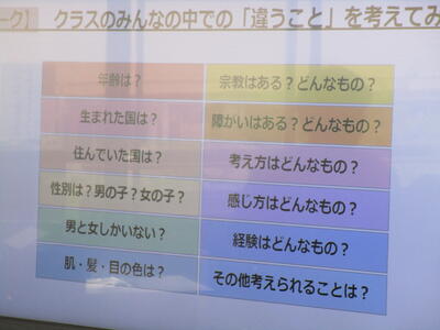 4年生、ZOZO TOWNの方3名が来校し、出前授業を行いました。「多様性」について考える授業で、友達との違いについて発表したり、「見た目でわかる違い」と「見ただけではわからない違い」に10個の項目をわけるため、グループごとにワークシートで話し合ったりする場面がありました。「年齢」「生まれた国」「肌・髪・目の色」「性別」「考え方」・・・。わけてみると、見ただけではわからない違いの方が圧倒的に多いことに子供たちも気づきました。「人のことを見た目で決めつけず、自分とは違うことを受け入れていくことが大切です」と講師の先生からお話がありました。