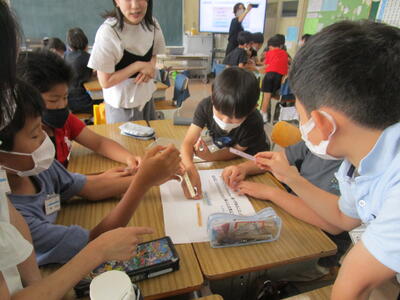 2年生、図工室でクレヨンの絵を指先でこすって、ぼかしていました。別のクラスは、白のクレヨンで生き物の絵をかいて、周りを絵の具で塗って生き物を登場させる「うかし絵」に挑戦していました。