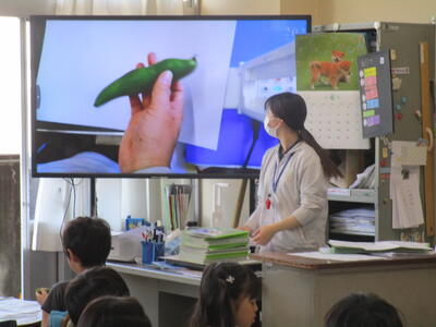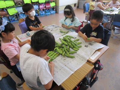 1年生、そら豆のさやむきに挑戦しました。給食の先生からは、そら豆がどんなふうになっているのか、皆で予想をした後に説明がありました。担任の先生が、そら豆のむき方を画像を使って丁寧に説明しました。子どもたちは、「皮が固い」と悪戦苦闘しながらも、中から豆が出てくると「できた!」「赤ちゃんがいる」など、笑顔でさまざまなつぶやきが・・・。1年生のむいたそら豆が今日の給食で提供されます。楽しみですね。