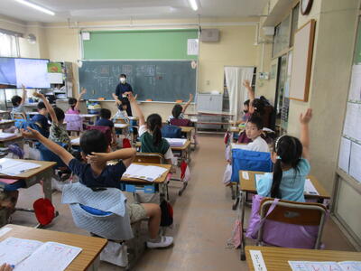 1年生、国語で「けむりのきしゃ」を教室で音読したり、ワークシートを書いたりしていました。背筋をピンと伸ばして、床に足をつけて、教科書をもって音読していました。隣のクラスでは、ワークシートを書いていましたが、2か月でずいぶんたくさんの量が書けるようになっていて驚きました。