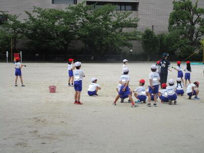 2年生、校庭で体育の授業、体育係さんが前に立ち、自分たちで整列して準備運動をしっかりとやっています。その後、投げる練習をしていました。
