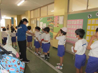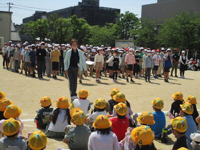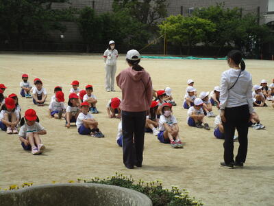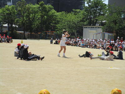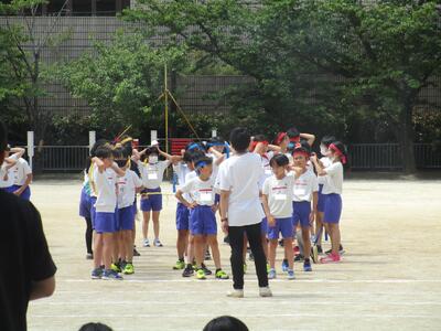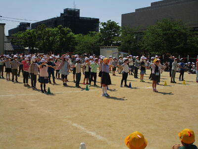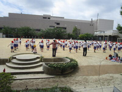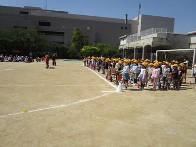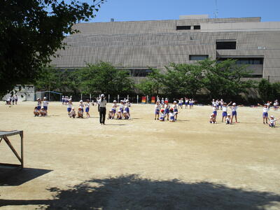 1年生、学年体育で「ラジオ体操」をやっていました。子どもたちは、前に立っている先生の真似をして、しっかりと準備運動をしていました。運動会練習をやる前に、心構えの話がありました。「運動会のダンスのときは、元気に笑顔で踊ってください」と先生が話すと子どもたちは、しっかり返事をしていました。話を聞く態度もとても立派でした。