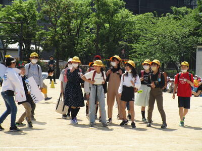 5年生、法被を着て、裸足で校庭で踊りました。隊形を変更したり、波の息を合わせたり、細かい部分を調整していました。集中してあきらめずに何度も練習する姿はとても、かっこいいですね。