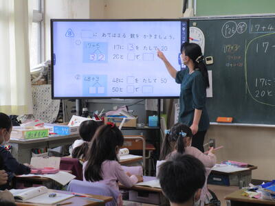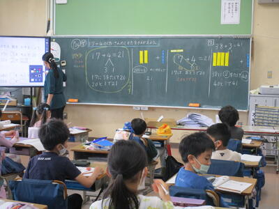 2年生、算数の2桁+1桁の繰り上がりのある計算を、黒板では、タイルを使って具体的に分かりやすく伝え、電子黒板も使って確認していました。
