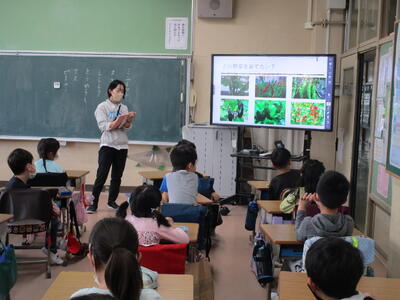 他のクラスでは、生活科で自分が育てる野菜を決めていました。「オクラ・唐辛子・ナス・ミニトマト・ピーマン・しし唐」の中から一つ選び、自分が育てたい野菜を伝えていました。聞き取りの結果、このクラスでは、「ミニトマト」「ピーマン」を育てたい子が多かったようです。