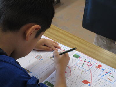 1年生、国語でひらがなを練習しています。鉛筆をゆっくり動かして、とても丁寧に書いていました。