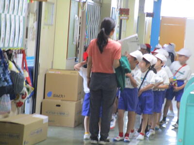 1年生は、1時間目に体育館で練習の後、教室に戻ってきていました。廊下の歩き方を丁寧に担任が確認しています。2年生は、これから体育館で学年練習です。廊下で半分の児童が並び方の確認をしながら、教室では残りの児童が画像を見ながらダンスの練習をしていました。