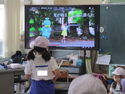 1年生、教室でダンスの練習です。先生が踊っている動画を見ながら、一緒に踊っていました。とても、楽しそうに笑顔で踊ってたので、見ているこちらも笑顔になりました。踊り終わると、「もう1回!、もう1回!」と子供たちからアンコールの声が。