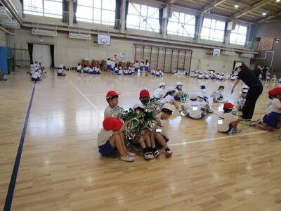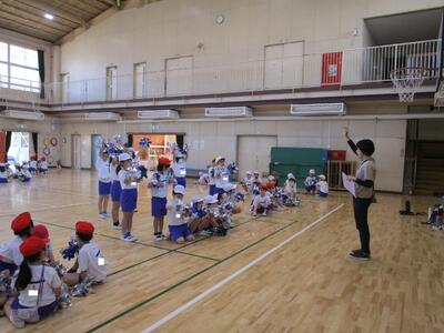 1年生、校庭で自分の場所を確認しながら、ダンスを踊っていました。最後は5人組のポーズを作っていました。2年生は、体育館で、キラキラのポンポンを持ちながら、クラスごとに最後の決めポーズの練習をしていました。