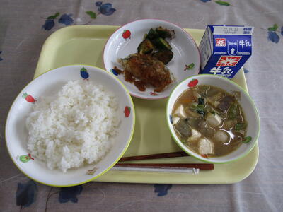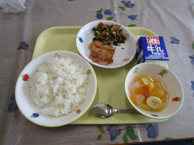 ご飯 チキンの照り焼き おかかあえ フルーツポンチ 牛乳
