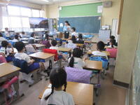 5年生は、全クラス道徳の授業をしていました。1組は「見えた答案」2組は「ありがとう上手に」3組は「いつも全力で」と、教科書の題材を使って話を進めていました。今日は、1組では3組の先生が、2組では1組の先生が、3組では2組の先生が授業展開をしていました。子どもたち、どのクラスも真剣に取り組んでいました。