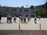 2年生、体育の学習で、校庭で整列の練習をした後に、ドッジビー用のディスクを投げる練習をしたり長縄をしたりしていました。