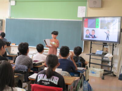 5年生、国語「すいせんしよう『町じまん』」の学習から、町ではなく、自分が自慢したいものを1枚のスライドを作成して紹介していました。親戚自慢や友達自慢、自分自慢などとてもわかりやすく皆に伝えていました。