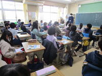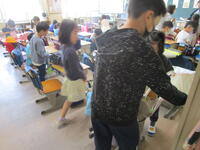 シェイクアウト訓練では、「安全行動1,2,3」の「ドロップ、カバー、ホールドオン」の避難行動を確認し、放送に従って、全校で実施しました。写真は、2年生の教室です。放送が流れると、即座に机の下にもぐり、真剣に訓練に参加していました。