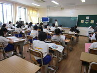 1年生が元気に登校しました。8:15に教室に行くと、4クラスとも机の上にランドセルを置いて、しっかり先生の話を聞いていました。ランドセルや黄帽の片づけ、机の中の筆箱の置き場等の確認をどのクラスも丁寧に行っていました。1年生頑張っていますね。