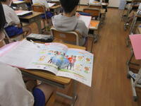 2年生は、自己紹介をするための「はがき新聞」を作成していました。担任の先生が書き方を説明して、名前と好きなものを中心に書いていました。テレビ画面に先生の見本を映したり、書き方を説明したりしていました。紙面が小さいので、2年生でも無理なく書けそうです。