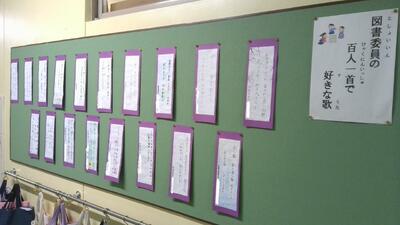 また、図書室前の廊下には図書委員会の児童が書いた「好きな歌」が掲示されており、全校が百人一首で盛り上がっています。百人一首を通して、日本の文化に親しむ心を育んでいきます。