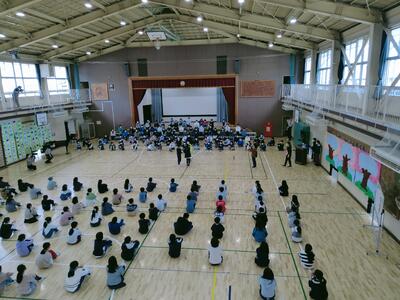 体育館には、たくさんの1・2年生が集まり、吹奏楽部の演奏を楽しんでいました。披露されたのは「うっせぇわ!」と「make you happy」です。どちらの曲もアップテンポの明るい雰囲気があり、1・2年生も生で聴く音楽に大喜びでした。