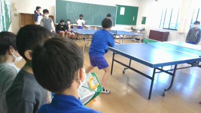 2枚目は、卓球クラブを見学しているところです。体育の学習でも、休み時間でも卓球は経験できないので、新鮮な気持ちで見学していたようでした。