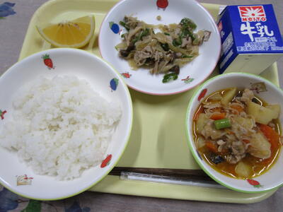 牛乳 ゆかりご飯 かじょう豆腐 たこのもやし炒め 冷凍みかん