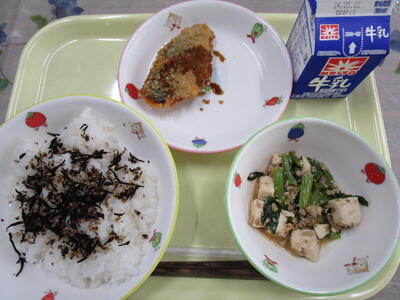 牛乳 ごはん ひじきのふりかけ アジフライ 豆腐と青菜のごま味噌炒め