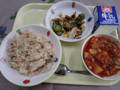 牛乳 さつまいもとハムのピラフ チリ・コン・カーン 海藻サラダ