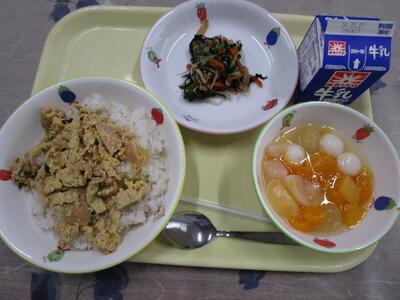 牛乳 麦ごはん あぶたま丼 磯香和え フルーツ白玉