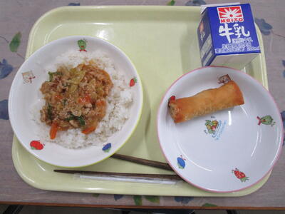 牛乳 ご飯 すき焼き風煮 チーズ春巻き 野菜炒め