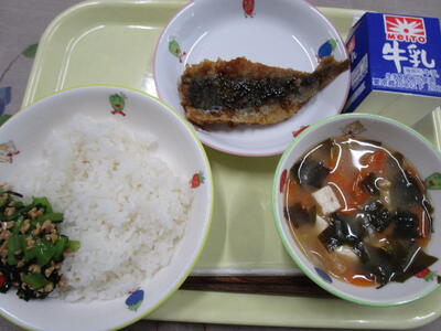 牛乳 ご飯 イワシのかば焼き 納豆和え わかめの味噌汁