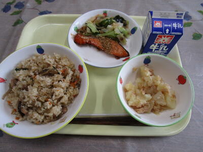 牛乳 五目御飯 サケの南部焼 ツナポテト 和風サラダ