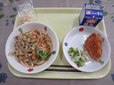 牛乳 焼きそば 鶏のから揚げ ゴマ酢和え フルーツヨーグルト