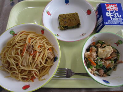 牛乳 和風スパゲッティ 豆腐のオイスター炒め おから抹茶ケーキ