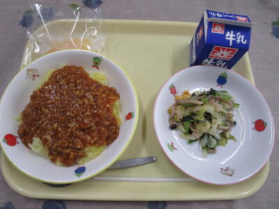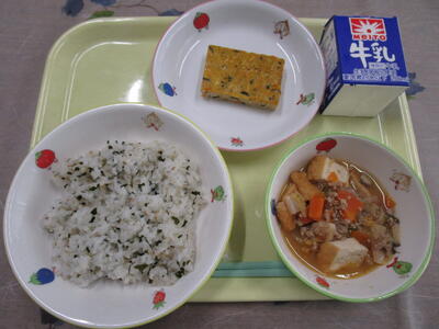 牛乳 わかめご飯 卵のちぐさ焼 春キャベツの土佐和え 生揚げとこんにゃくのピリ辛炒め