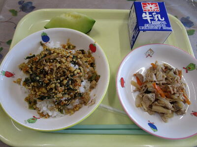牛乳 じゃこなめし 生揚げの肉みそ煮 磯香和え メロン