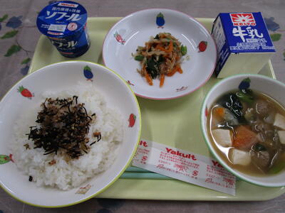 牛乳 ひじきのふりかけ ご飯 つみれ汁 ツナ和え ヨーグルト