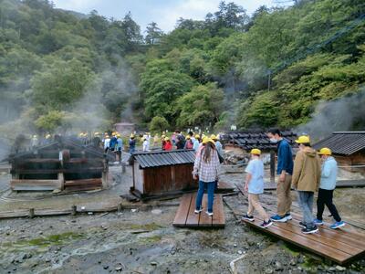 バスから降りると、少し離れた所でも、温泉特有の硫黄の匂いが感じられました。ポコポコと温泉が湧き出ていたり、溜まっているところが白くなっていたりして、初めて行く場所には多くの発見があったようです。