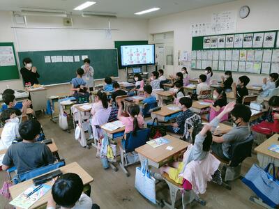 黒板の絵カードや大型提示装置に映ったデジタル教科書を活用しながら、英語でのやり取りを楽しむ工夫が見られました。