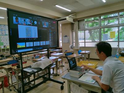 英語の学習では、専科の先生もオンライン指導に参加。普段より、口の動かし方や表情が見えやすい分、ハキハキと発音している6年生が多かったようです。